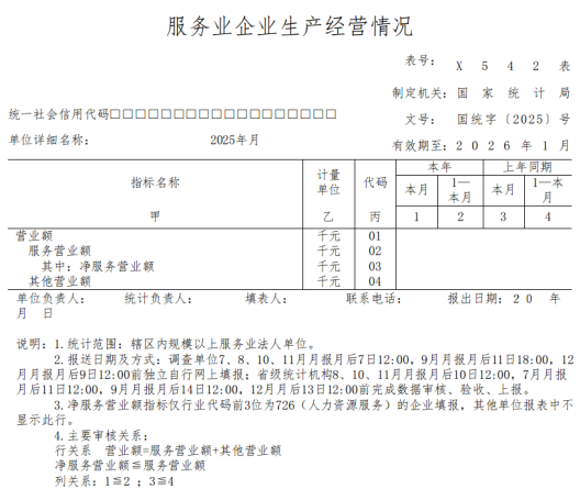调查单位按照要求及时准确填报月度服务业企业生产经营情况报表,包括营业额、服务营业额、净服务营业额、其他营业额等相关统计指标。