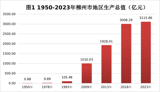 柳州市1950年经济总量为0.88亿元,到2023年达到3115.86亿元,1950-2023年年均增长11.8%。改革开放以后,全市经济快速发展,1979年全市经济总量突破10亿元,1993年经济总量突破100亿元,2009年突破1000亿元大关,特别是党的十八大以来,经济总量继续积累,到2018年突破3000亿元,站上了新的历史起点。