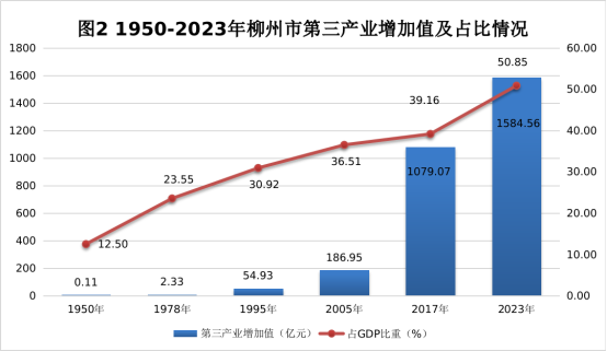 从新中国成立至改革开放前期,柳州市第三产业发展相对缓慢。1950年全市第三产业增加值仅为1100万元,到1978年也只有2.33亿元。改革开放以后,第三产业随市场繁荣而日益兴旺,进入蓬勃发展阶段,第三产业增加值由1978年的2.33亿元增长到2000年的106.93亿元,突破100亿元,到2017年突破1000亿元大关。2023年,柳州市第三产业增加值达到1584.56亿元,第三产业增加值占全市地区生产总值的比重由1950年的12.50%提升到2023年的50.85%,成为稳定柳州经济增长的重要支撑。