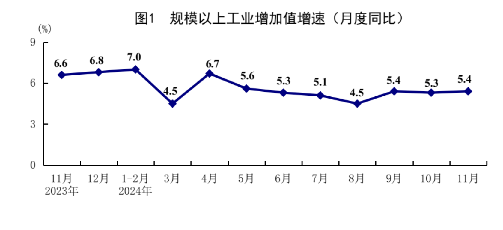 11月份,全国规模以上工业增加值同比增长5.4%,比上月加快0.1个百分点;环比增长0.46%。分三大门类看,采矿业增加值同比增长4.2%,制造业增长6.0%,电力、热力、燃气及水生产和供应业增长1.6%。装备制造业增加值同比增长7.6%,比上月加快1.0个百分点;高技术制造业增加值增长7.8%,快于全部规模以上工业增加值2.4个百分点。分经济类型看,国有控股企业增加值同比增长3.9%;股份制企业增长6.0%,外商及港澳台投资企业增长3.4%;私营企业增长4.5%。分产品看,新能源汽车、工业机器人、集成电路产品产量同比分别增长51.1%、29.3%、8.7%。1-11月份,全国规模以上工业增加值同比增长5.8%。11月份,制造业采购经理指数为50.3%,比上月上升0.2个百分点;企业生产经营活动预期指数为54.7%,上升0.7个百分点。1-10月份,全国规模以上工业企业实现利润总额58680亿元,同比下降4.3%。