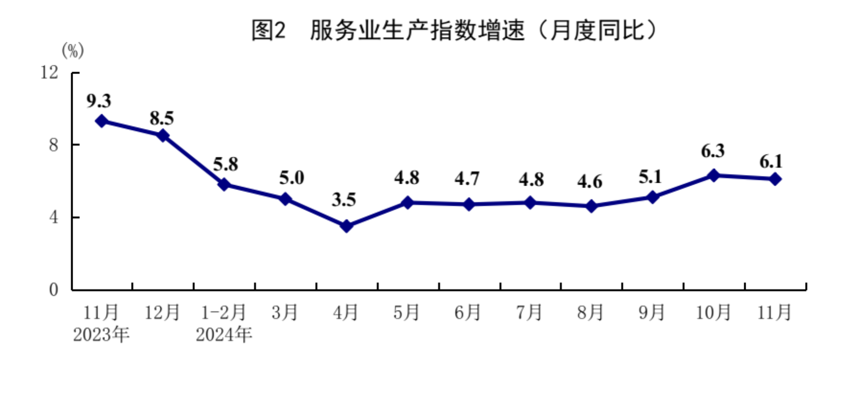11月份,全国服务业生产指数同比增长6.1%。分行业看,信息传输、软件和信息技术服务业,租赁和商务服务业,金融业生产指数同比分别增长9.3%、9.3%、8.8%,分别快于服务业生产指数3.2、3.2、2.7个百分点;房地产业,交通运输、仓储和邮政业生产指数分别增长2.9%、6.0%,分别比上月加快2.1、1.3个百分点。1-11月份,全国服务业生产指数同比增长5.1%。1-10月份,规模以上服务业企业营业收入同比增长7.4%。11月份,服务业商务活动指数为50.1%,与上月持平;服务业业务活动预期指数为57.3%,比上月上升1.1个百分点。其中,电信广播电视及卫星传输服务、互联网软件及信息技术服务、货币金融服务、资本市场服务、保险等行业商务活动指数位于55.0%以上较高景气区间。