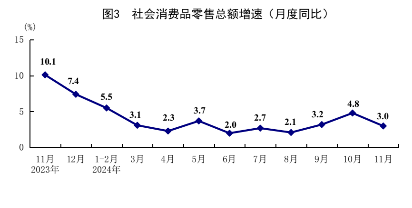 11月份,社会消费品零售总额43763亿元,同比增长3.0%;环比增长0.16%。按经营单位所在地分,城镇消费品零售额37596亿元,同比增长2.9%;乡村消费品零售额6167亿元,增长3.2%。按消费类型分,商品零售额37961亿元,增长2.8%;餐饮收入5802亿元,增长4.0%。消费品以旧换新政策持续显效,限额以上单位家用电器和音像器材类、家具类、汽车类、建筑及装潢材料类商品零售额分别增长22.2%、10.5%、6.6%、2.9%。1-11月份,社会消费品零售总额442723亿元,同比增长3.5%。全国网上零售额140308亿元,同比增长7.4%。其中,实物商品网上零售额118059亿元,增长6.8%,占社会消费品零售总额的比重为26.7%。1-11月份,服务零售额同比增长6.4%。