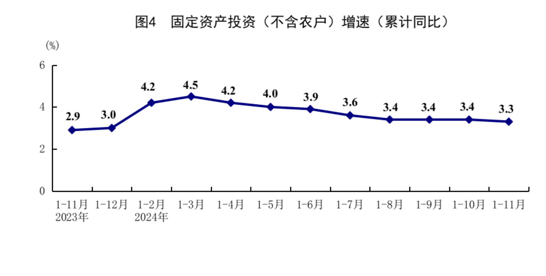 1-11月份,全国固定资产投资(不含农户)465839亿元,同比增长3.3%;扣除房地产开发投资,全国固定资产投资增长7.4%。分领域看,基础设施投资同比增长4.2%,制造业投资增长9.3%,房地产开发投资下降10.4%。全国新建商品房销售面积86118万平方米,同比下降14.3%,降幅比1-10月份收窄1.5个百分点;新建商品房销售额85125亿元,下降19.2%,降幅收窄1.7个百分点。分产业看,第一产业投资同比增长2.4%,第二产业投资增长12.0%,第三产业投资下降1.0%。民间投资同比下降0.4%;扣除房地产开发投资,民间投资增长6.2%。高技术产业投资同比增长8.8%,其中高技术制造业和高技术服务业投资分别增长8.2%、10.2%。高技术制造业中,航空、航天器及设备制造业,电子及通信设备制造业投资分别增长35.4%、8.8%;高技术服务业中,专业技术服务业、电子商务服务业投资分别增长27.9%、12.5%。11月份,固定资产投资(不含农户)环比增长0.10%。