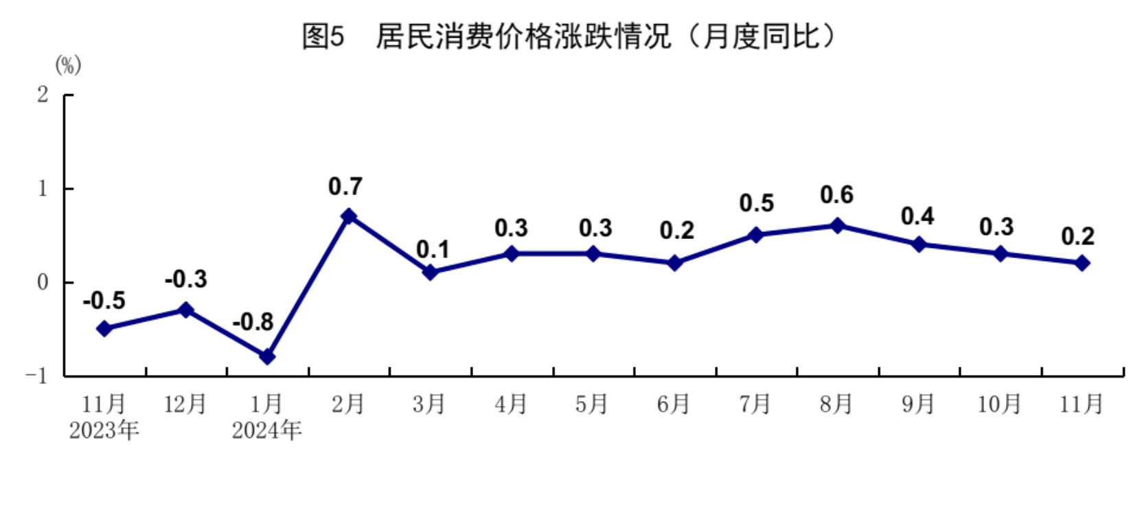 11月份,全国居民消费价格(CPI)同比上涨0.2%;环比下降0.6%。分类别看,食品烟酒价格同比上涨0.9%,衣着价格上涨1.1%,居住价格下降0.1%,生活用品及服务价格下降0.3%,交通通信价格下降3.6%,教育文化娱乐价格上涨1.0%,医疗保健价格上涨1.1%,其他用品及服务价格上涨5.2%。在食品烟酒价格中,粮食价格下降1.1%,鲜果价格下降0.3%,鲜菜价格上涨10.0%,猪肉价格上涨13.7%。扣除食品和能源价格后的核心CPI同比上涨0.3%,涨幅比上月扩大0.1个百分点。1-11月份,全国居民消费价格同比上涨0.3%。