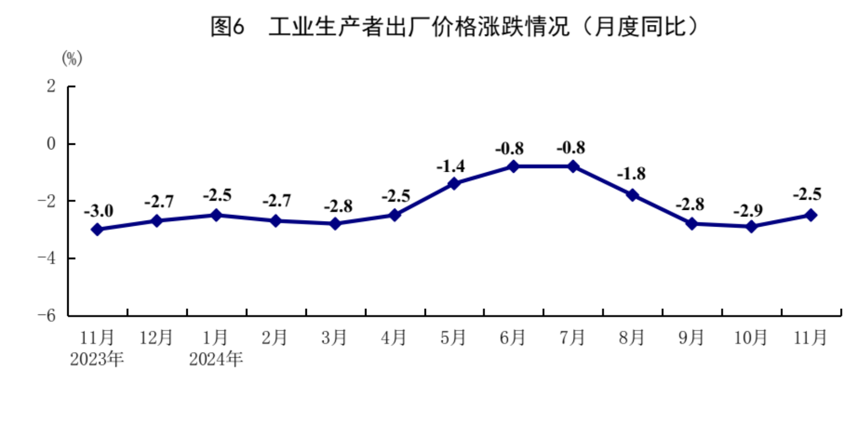 11月份,全国工业生产者出厂价格同比下降2.5%,降幅比上月收窄0.4个百分点;环比上涨0.1%。全国工业生产者购进价格同比下降2.5%,降幅收窄0.2个百分点;环比下降0.1%。1-11月份,全国工业生产者出厂价格和购进价格同比分别下降2.1%和2.2%。